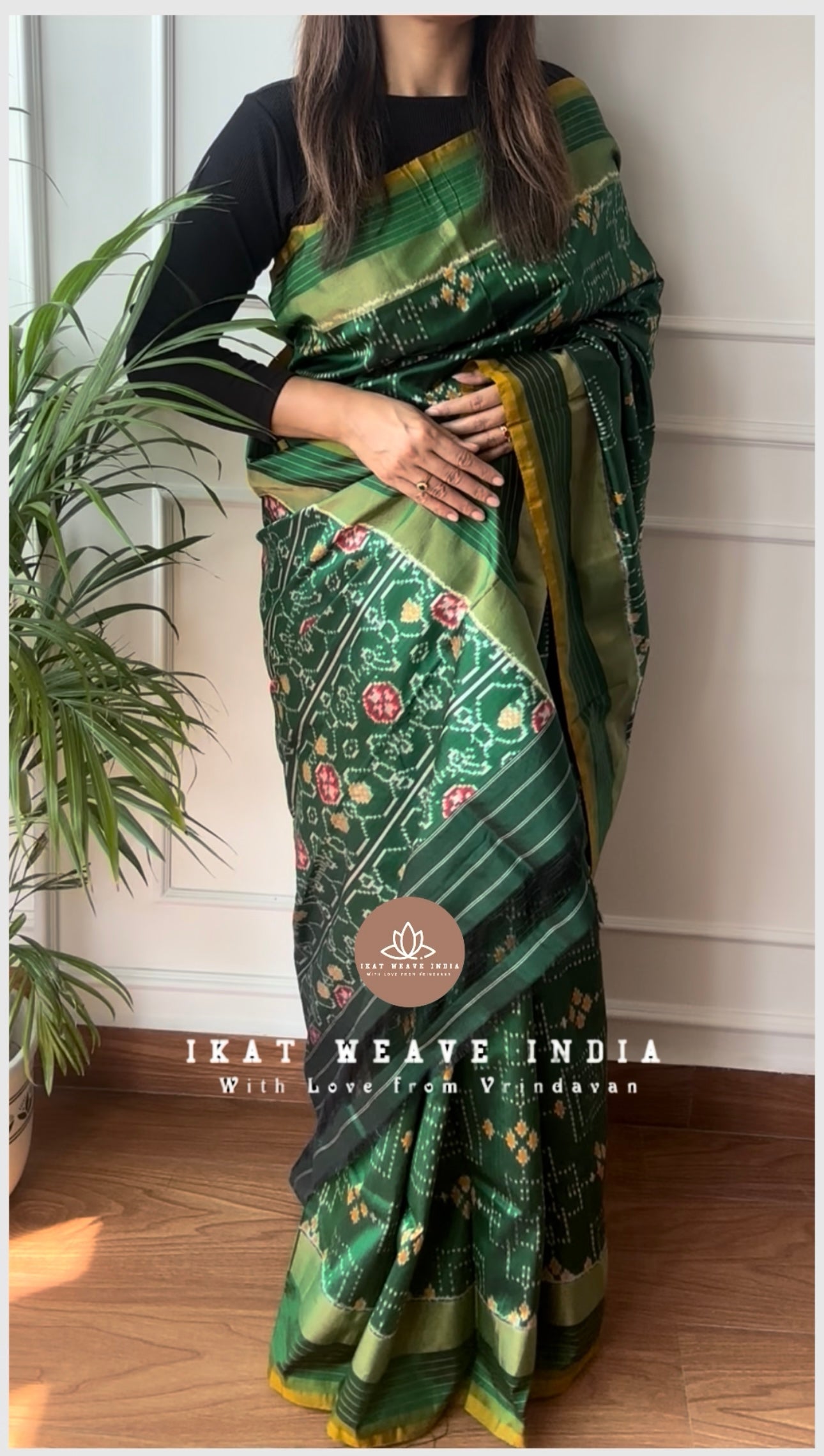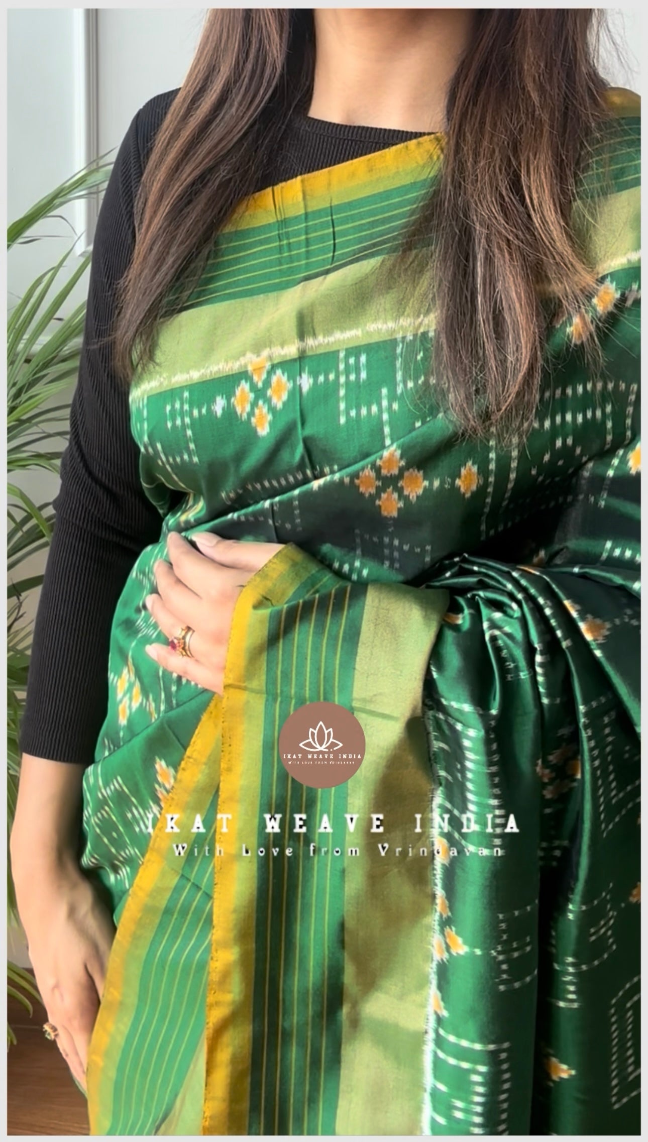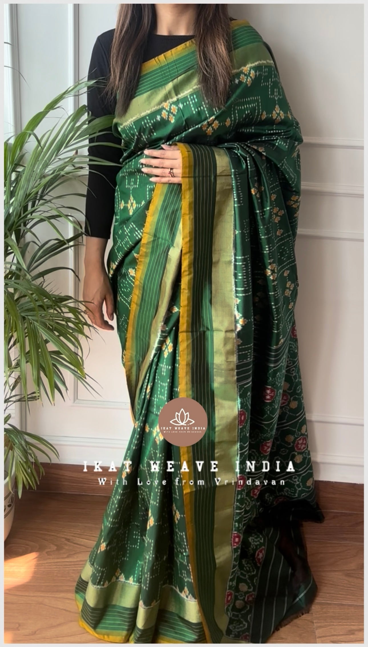 Exquisite handwoven double ikat pure silk saree, intricate Bandhani inspired design all over body. Intricate design pallu & beautiful color making the saree absolutely stunning. Saree comes with a running blouse piece.