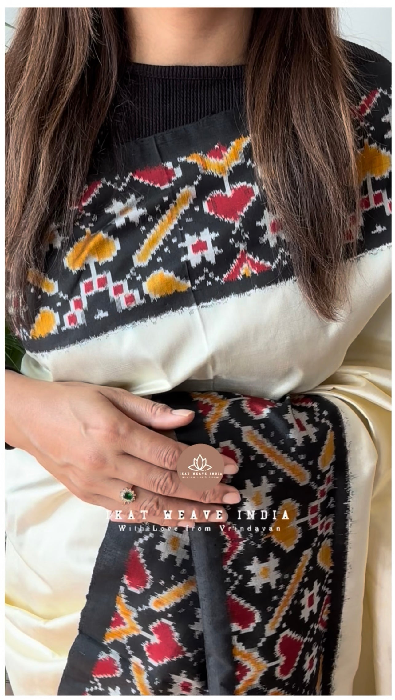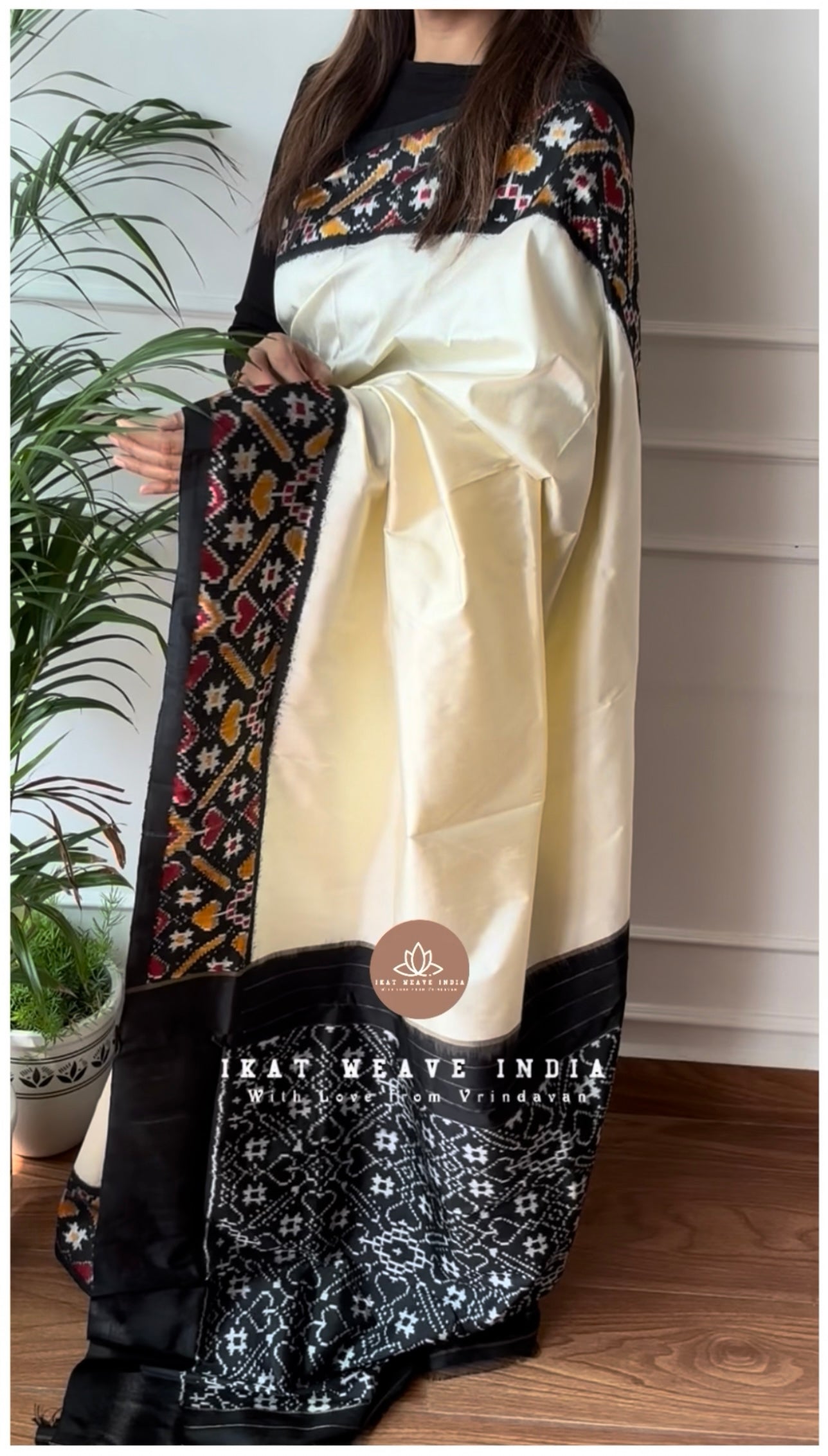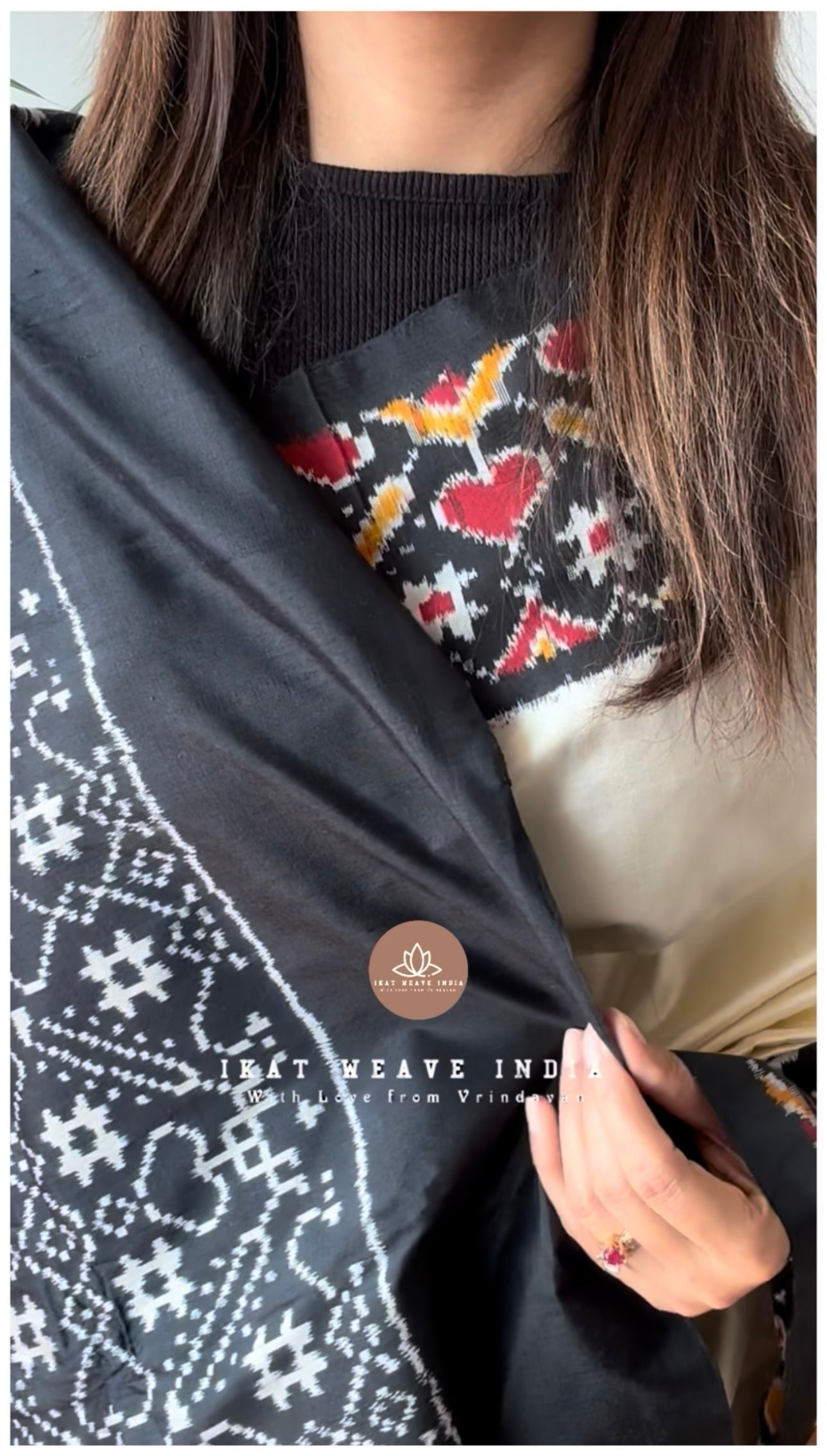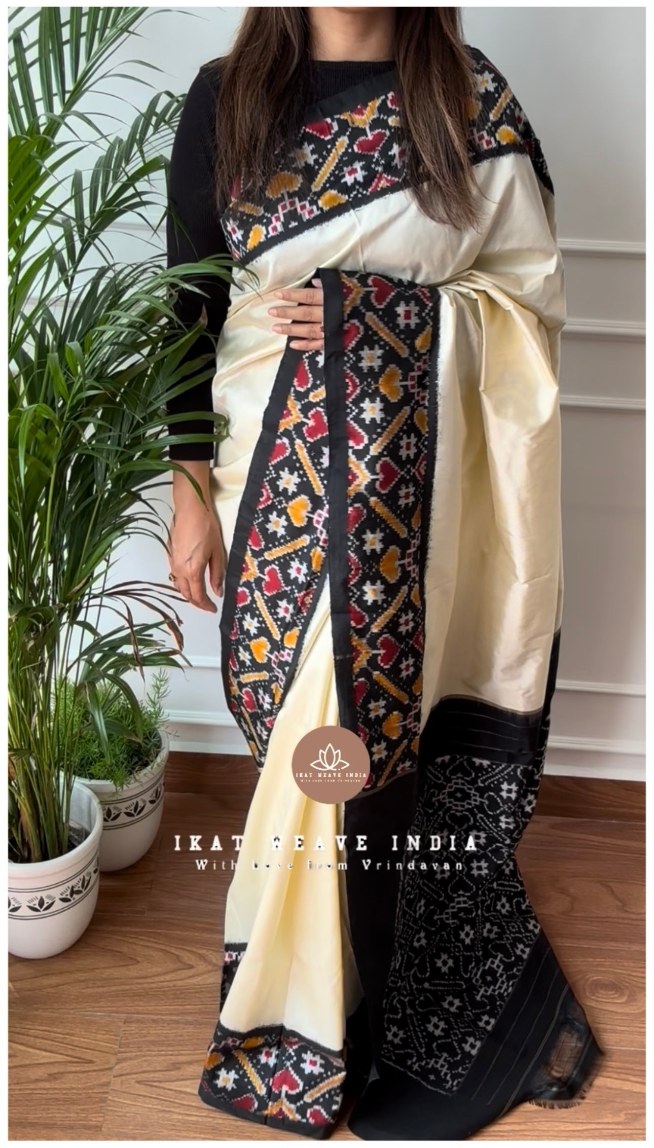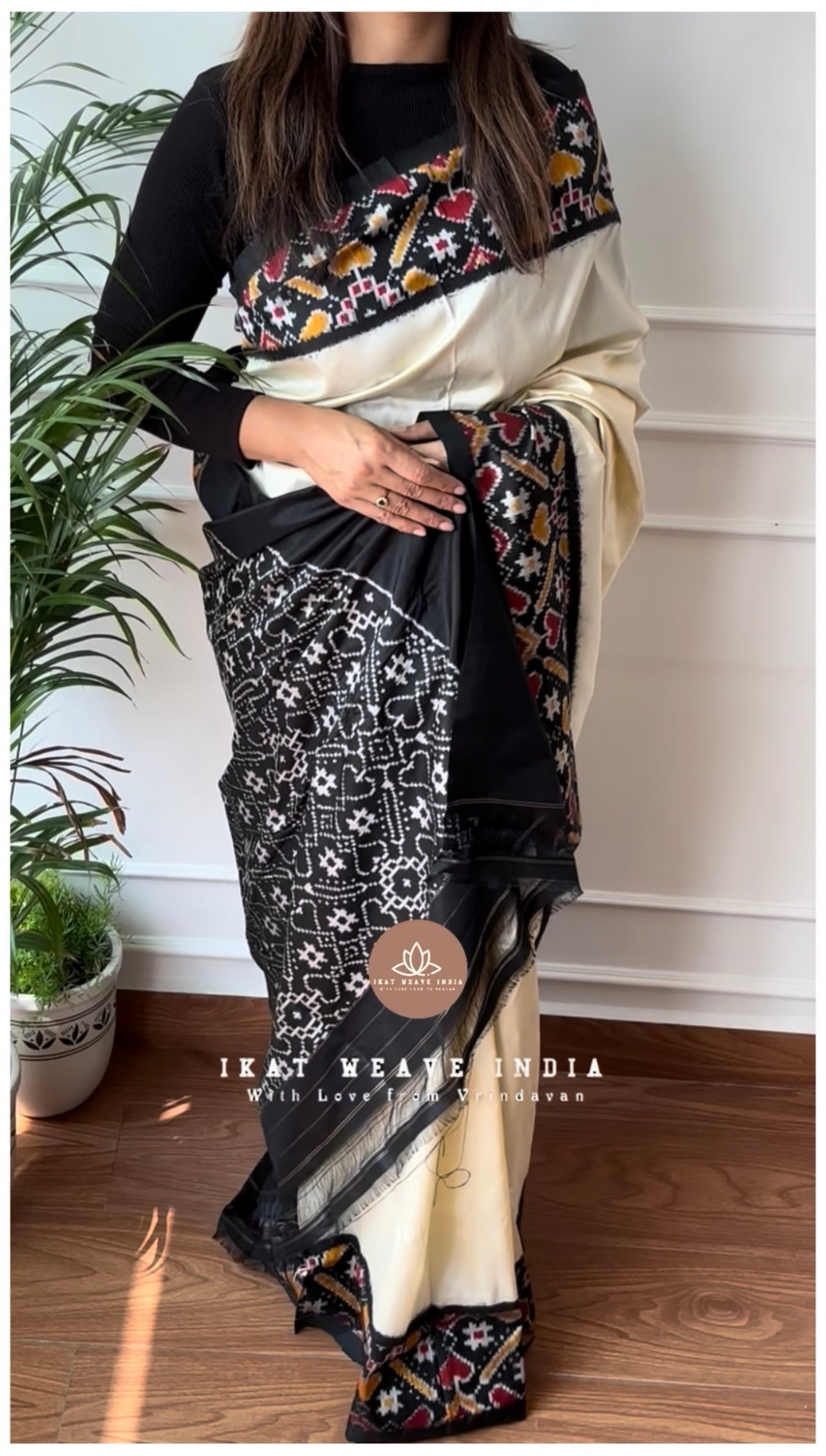 Exquisite double Ikat handwoven pure silk saree, patola inspired design border and pallu making the saree absolutely stunning. Saree comes with a running blouse piece.