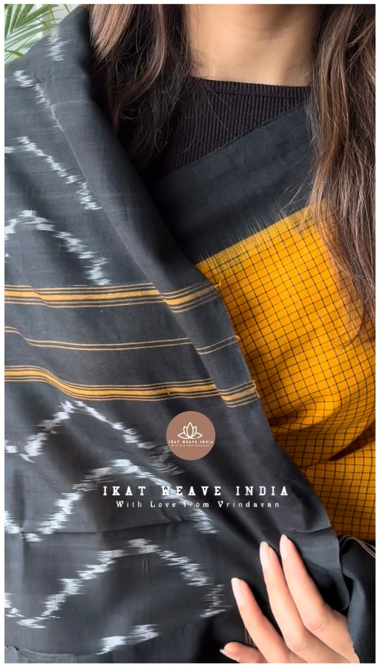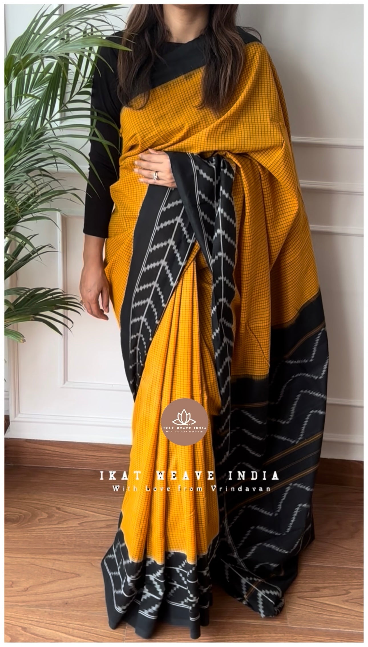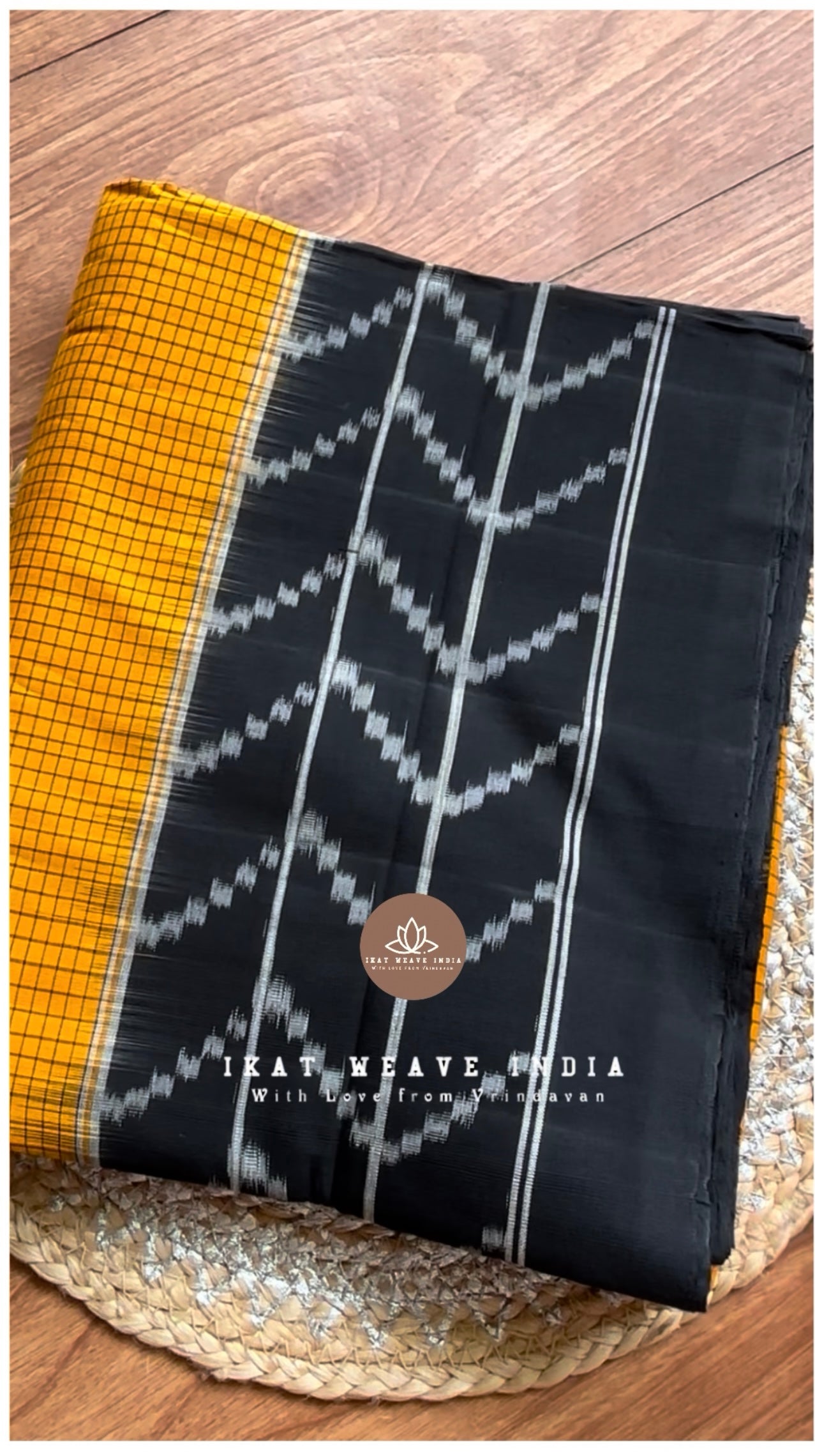 Exquisite handwoven ikat pure cotton saree, intricate design all over body & beautiful color combination making the saree absolutely stunning. Saree comes with a running blouse piece.