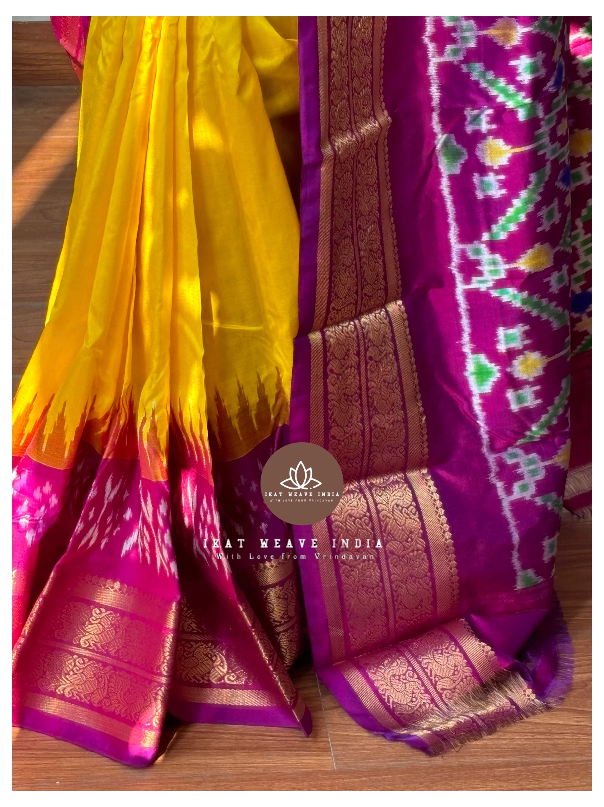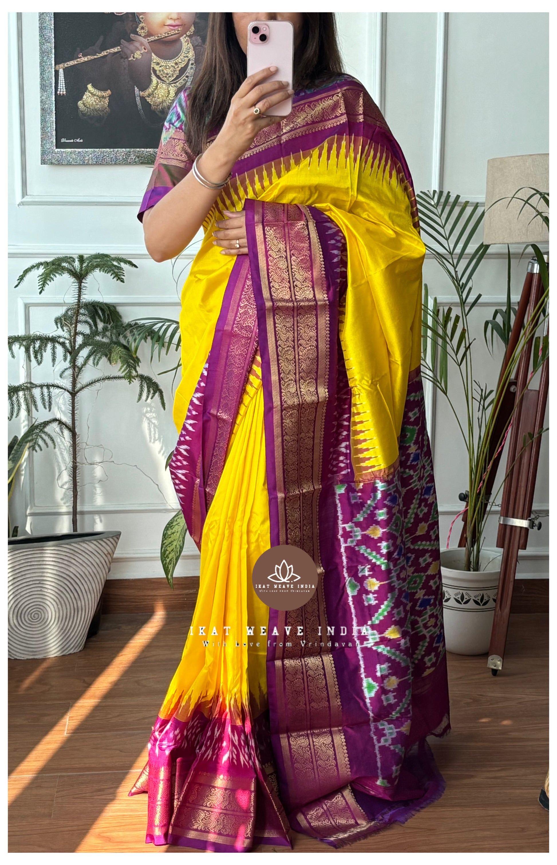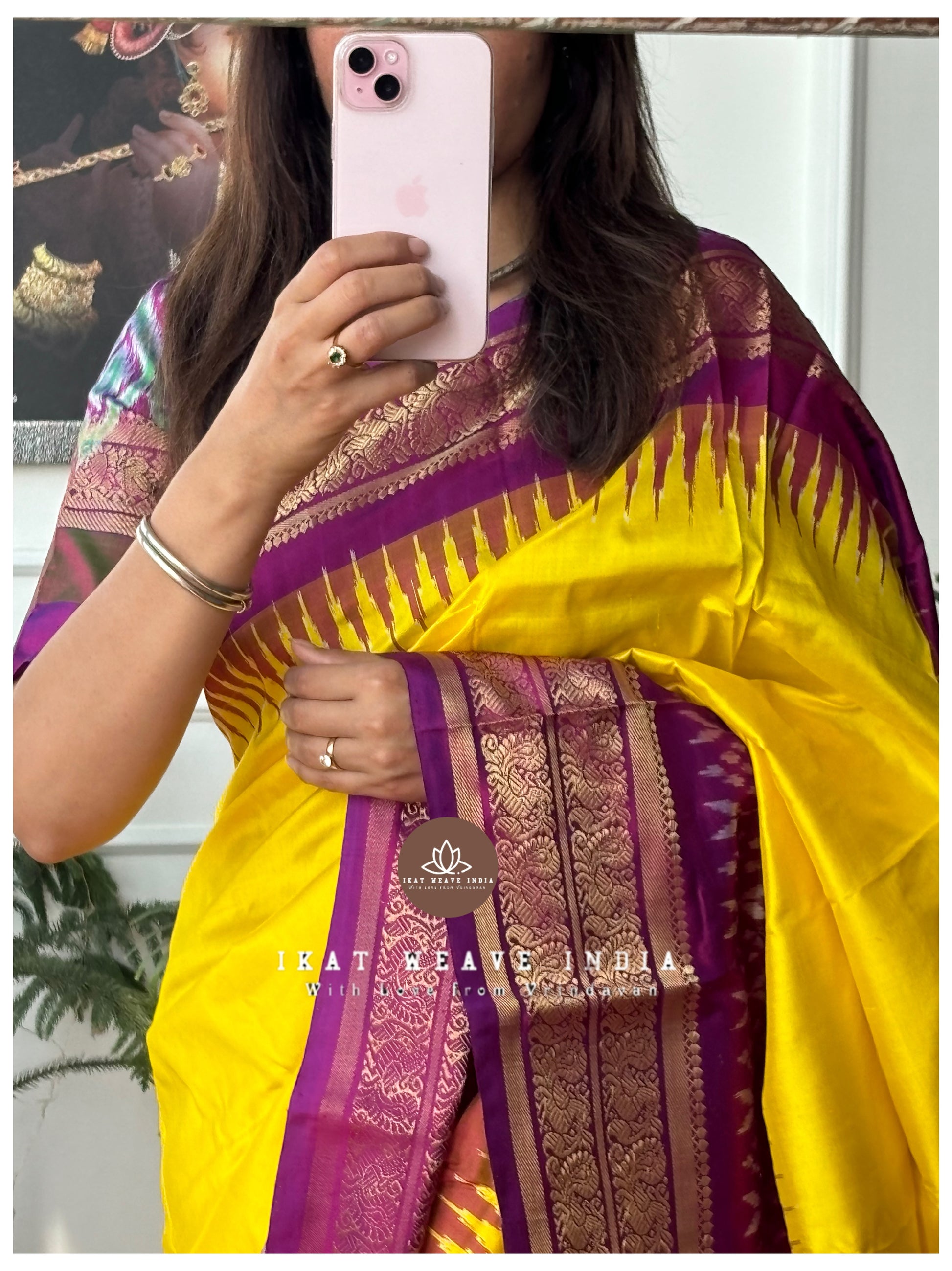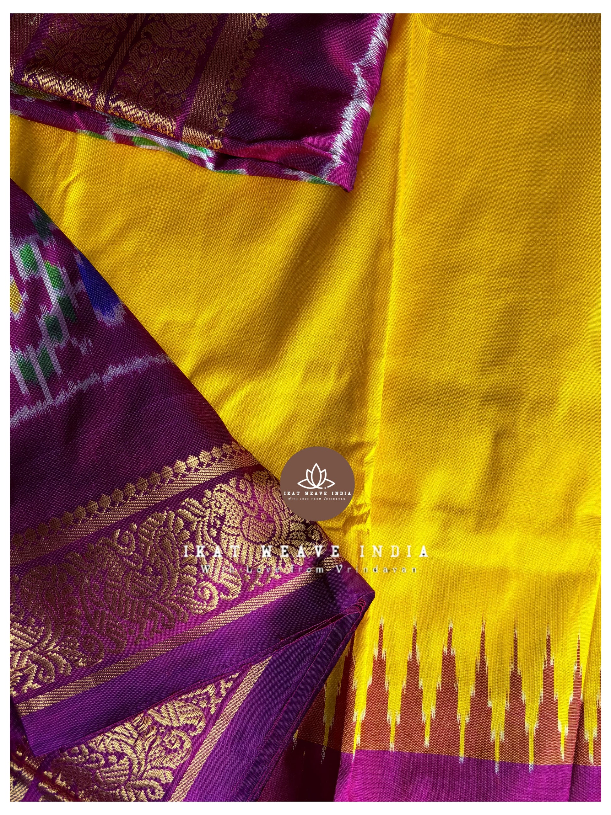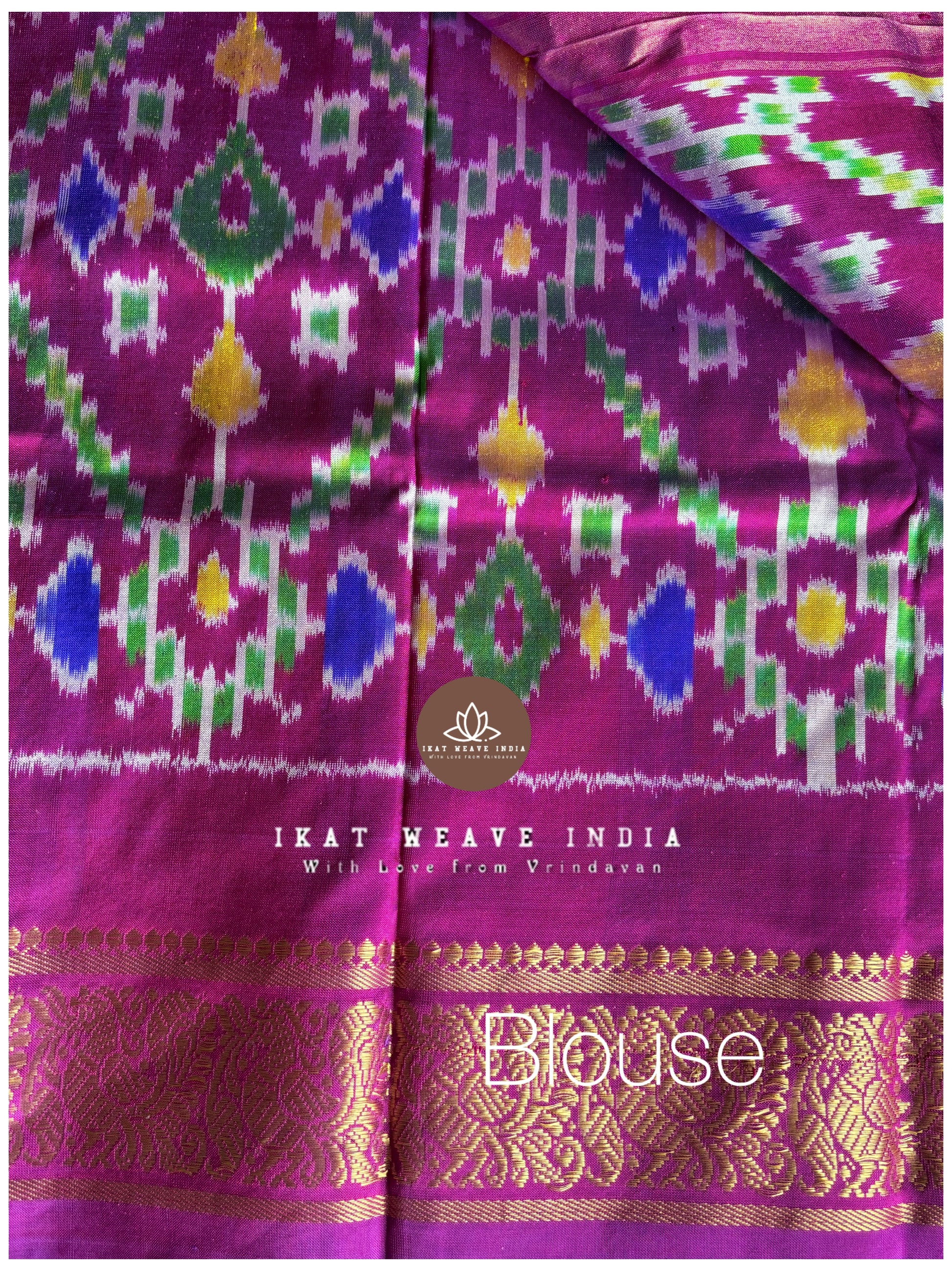 Exquisite handwoven ikat pure silk saree, intricate zari design border, pallu & beautiful colour combination making the saree absolutely stunning. Saree comes with a running blouse piece.