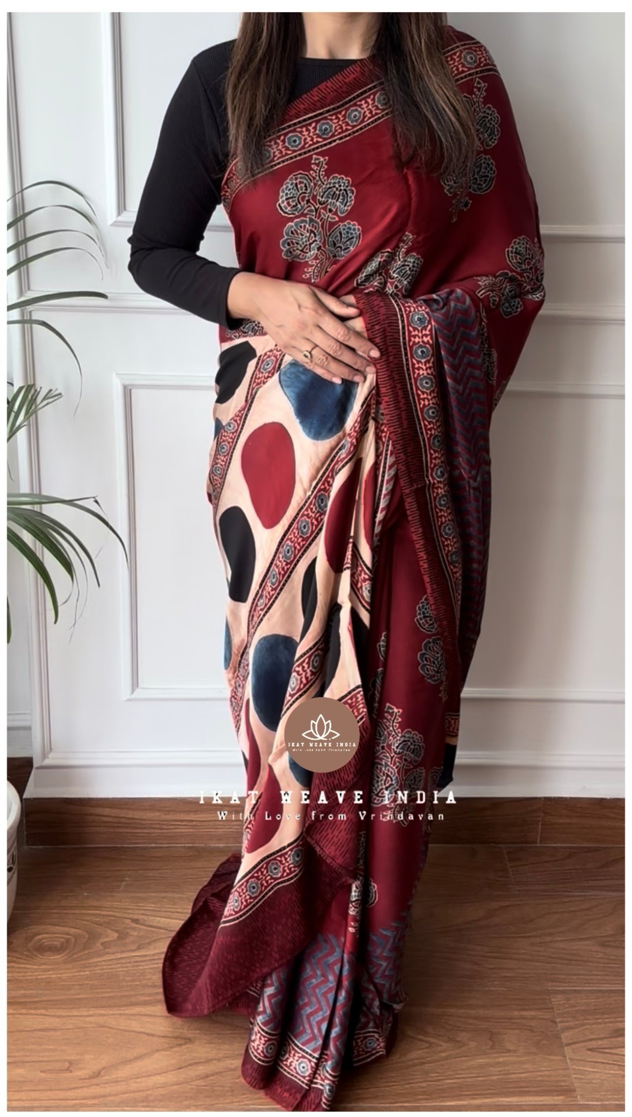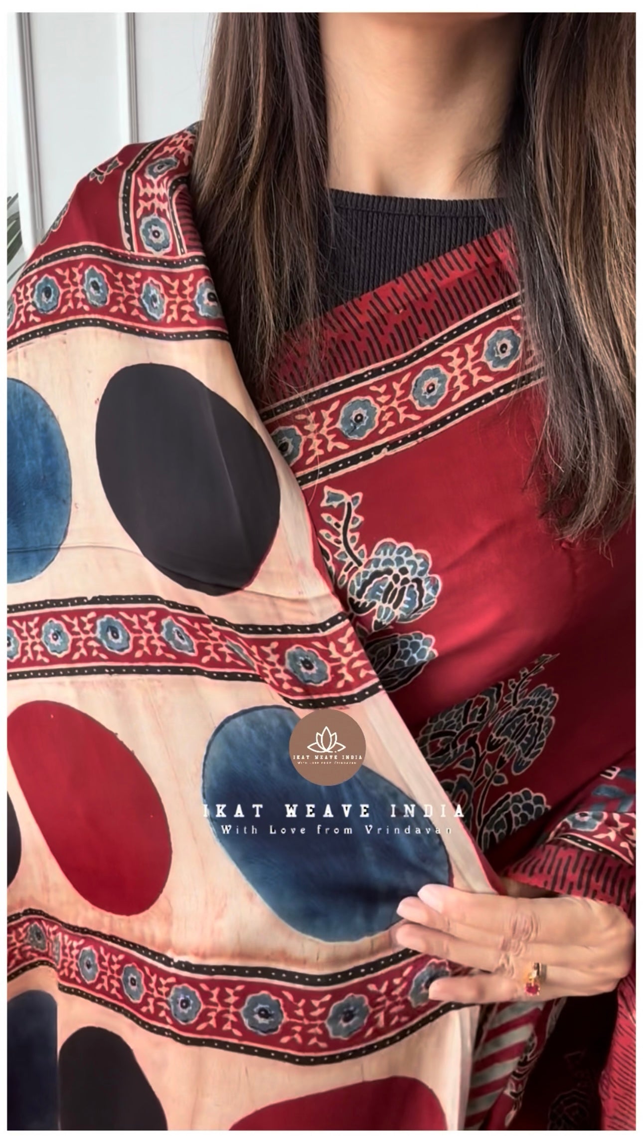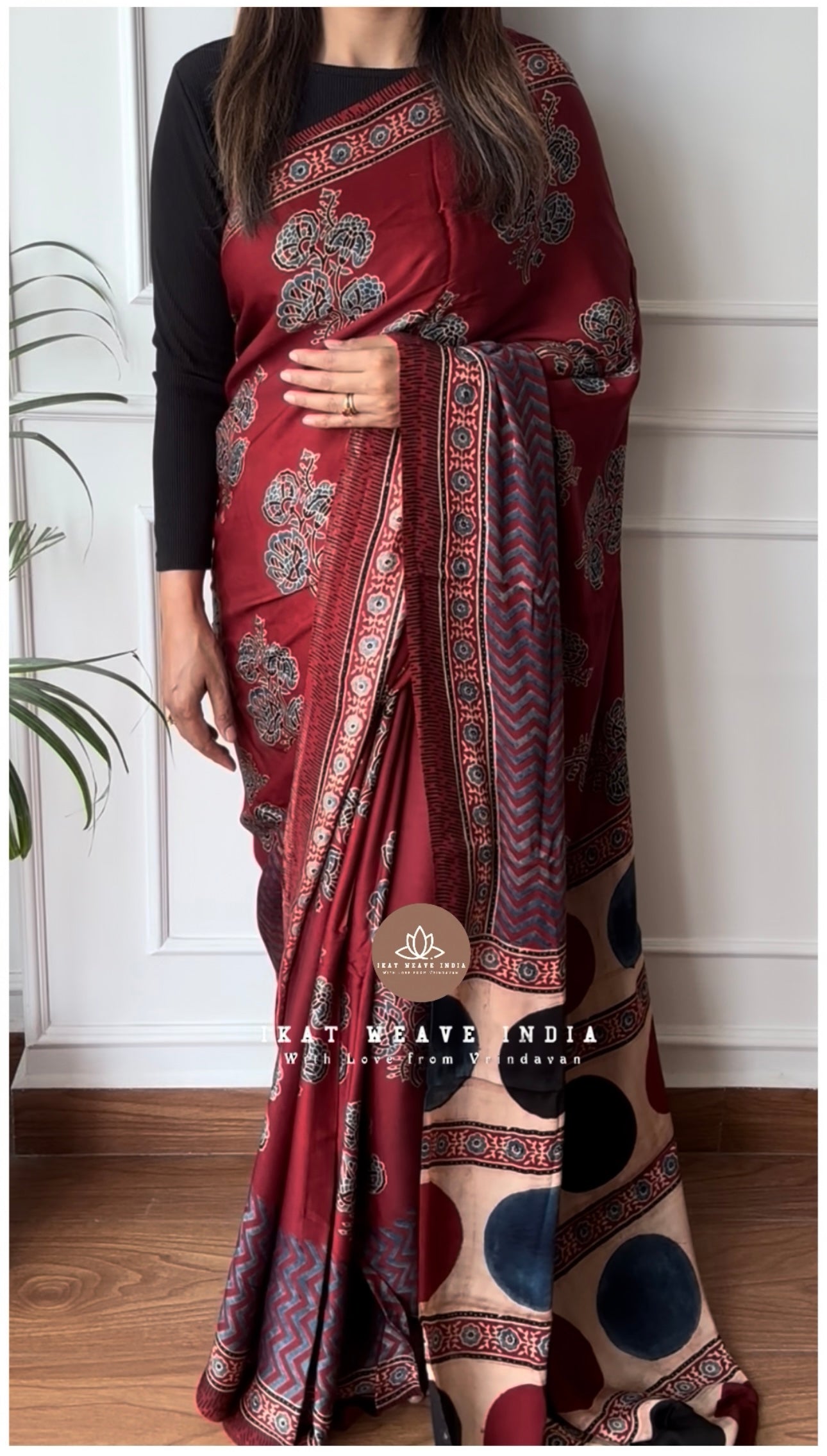 Natural dyed Ajrakh modal silk sarees Lustrous and exceptional craftsmanship. Handmade and handcrafted with traditional designs which reflect the rich cultural identity and skilful artistry that flourished in Gujarat over the time.