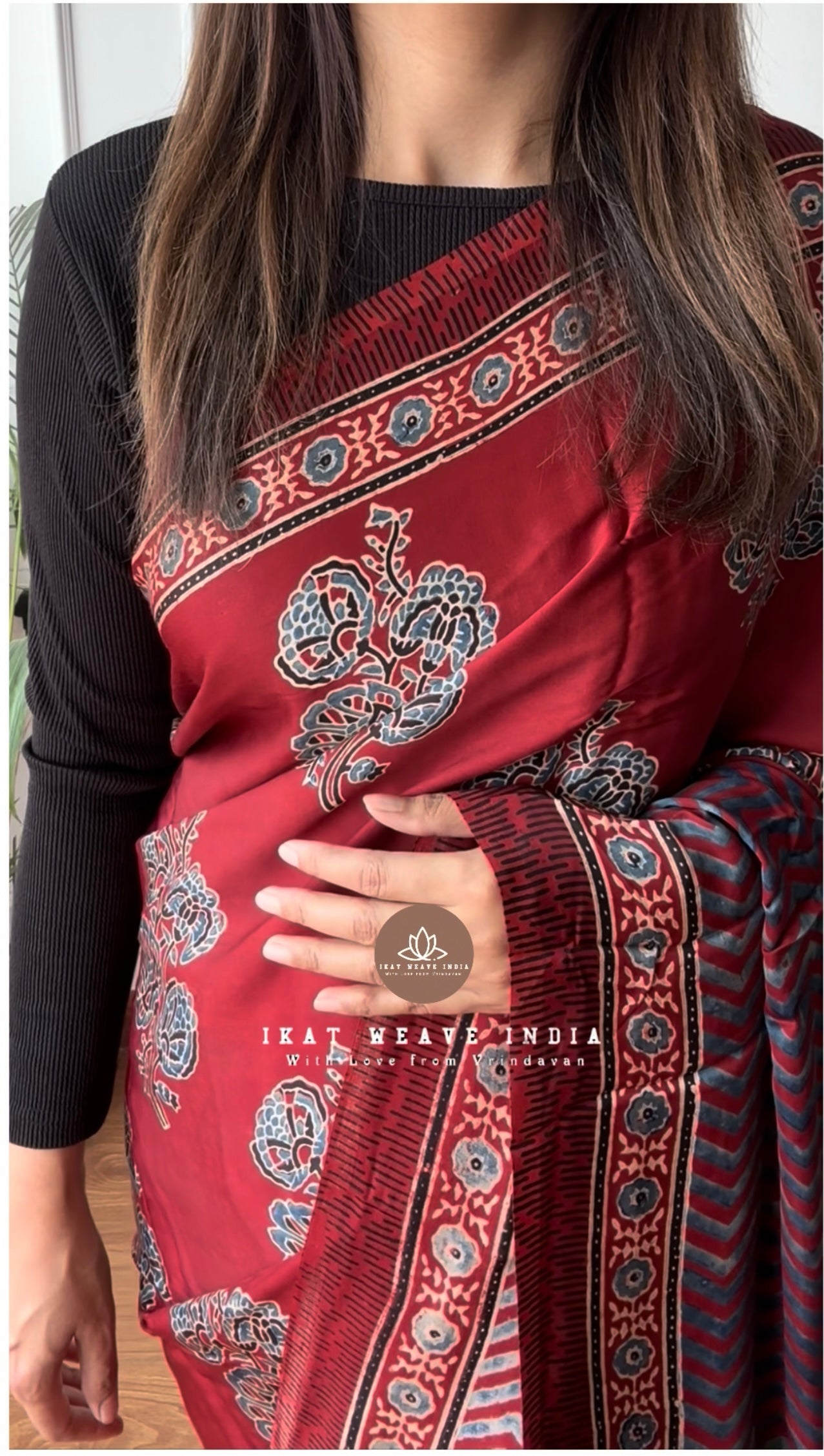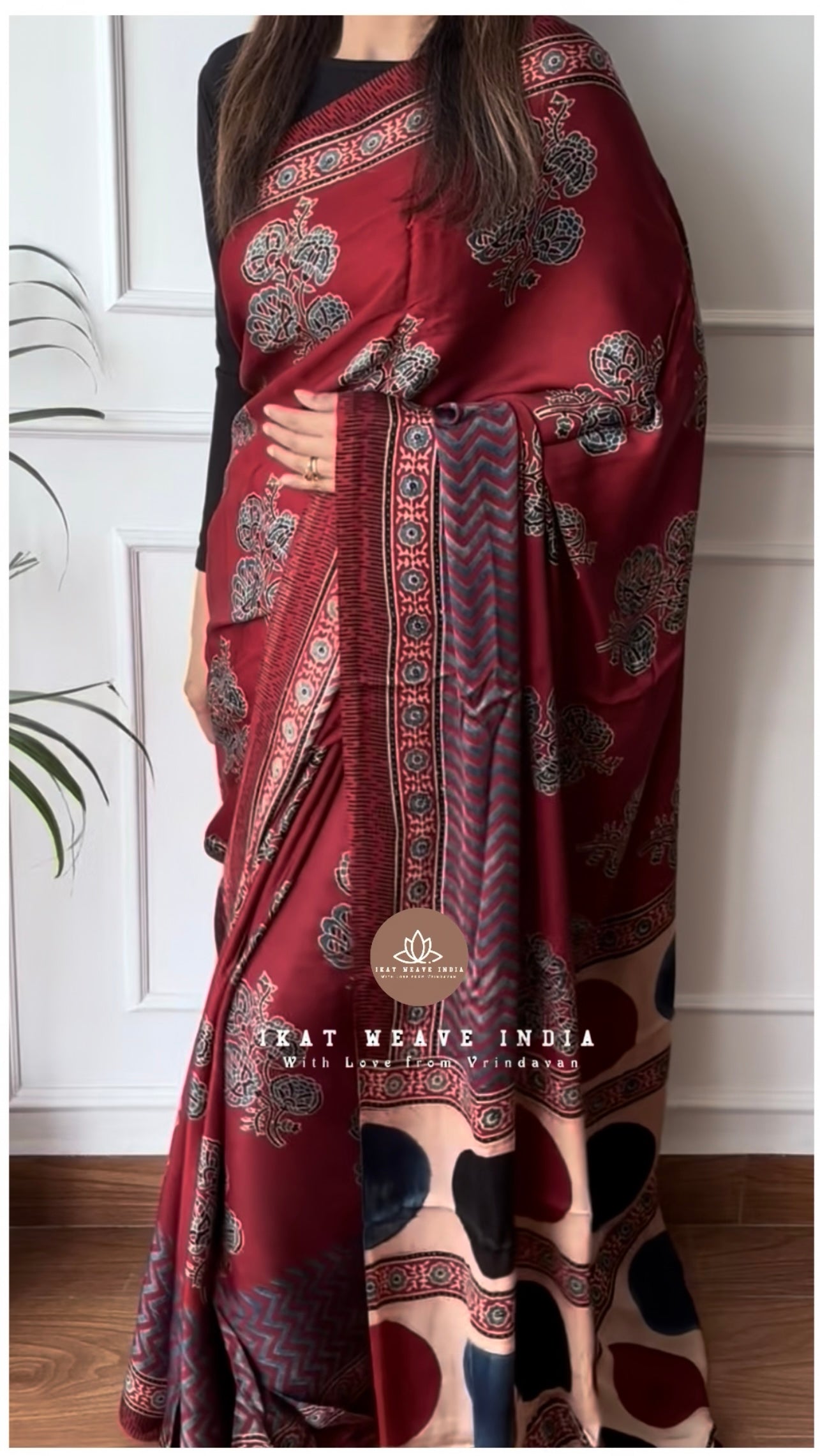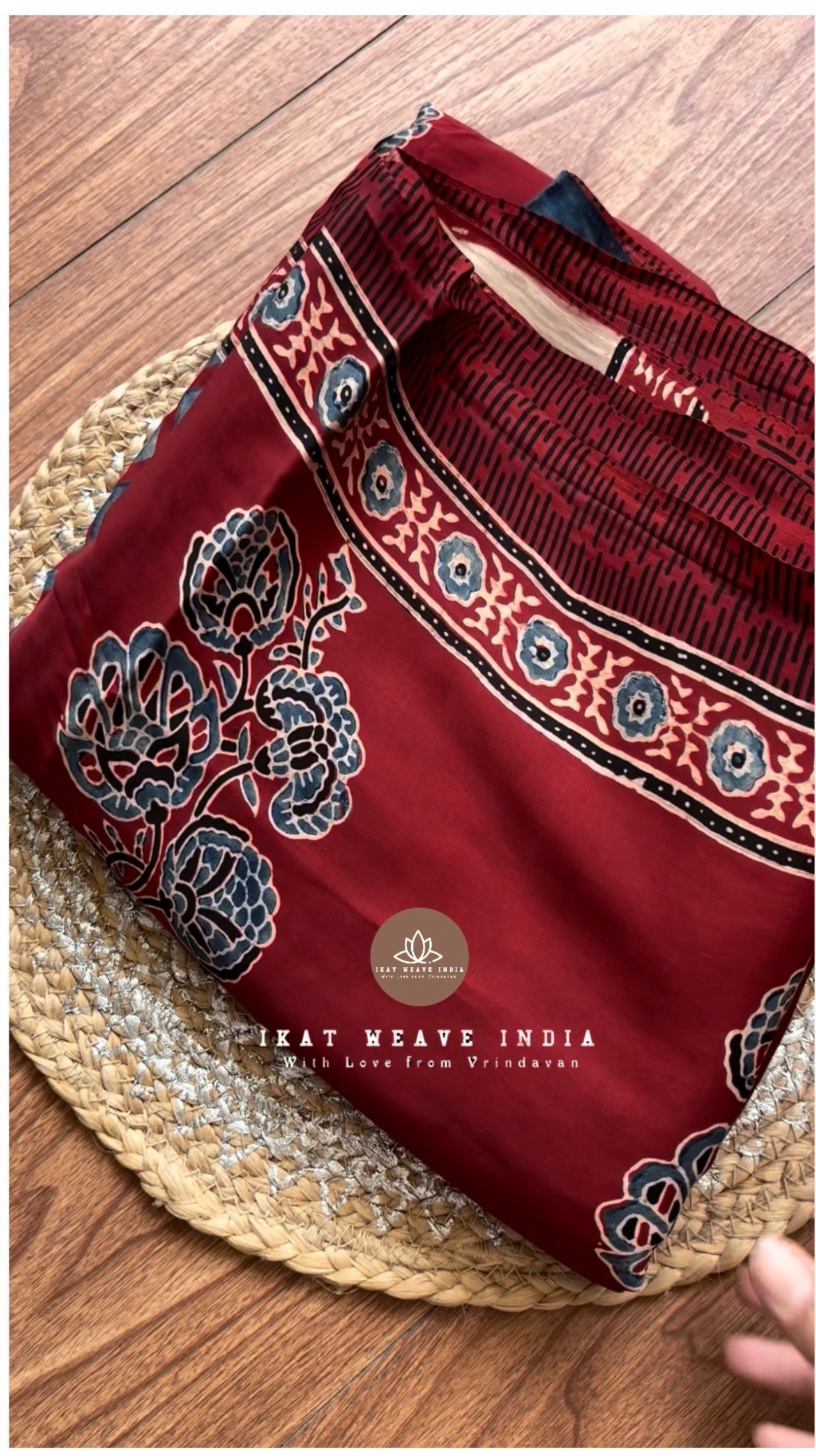 Natural dyed Ajrakh modal silk sarees Lustrous and exceptional craftsmanship. Handmade and handcrafted with traditional designs which reflect the rich cultural identity and skilful artistry that flourished in Gujarat over the time.