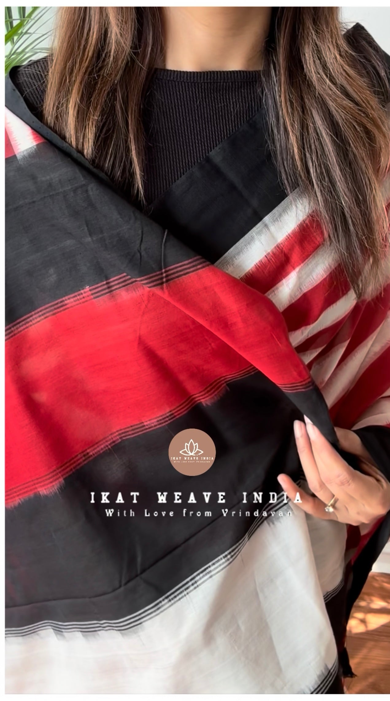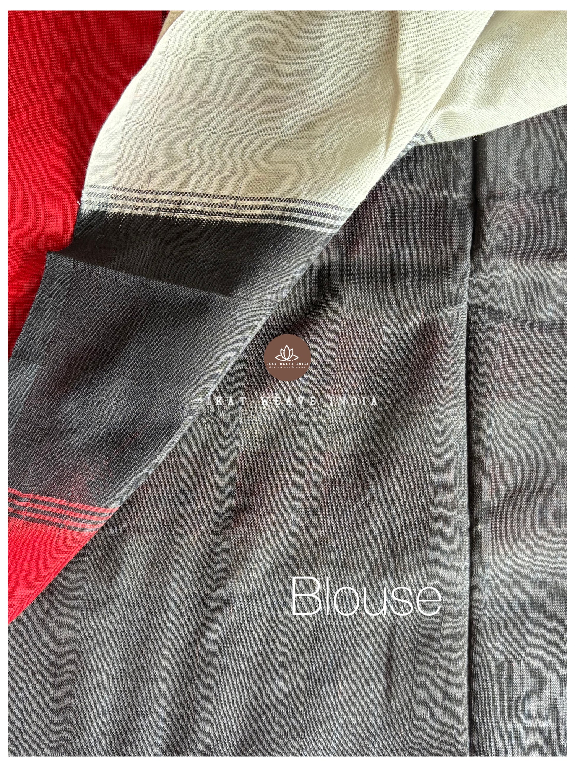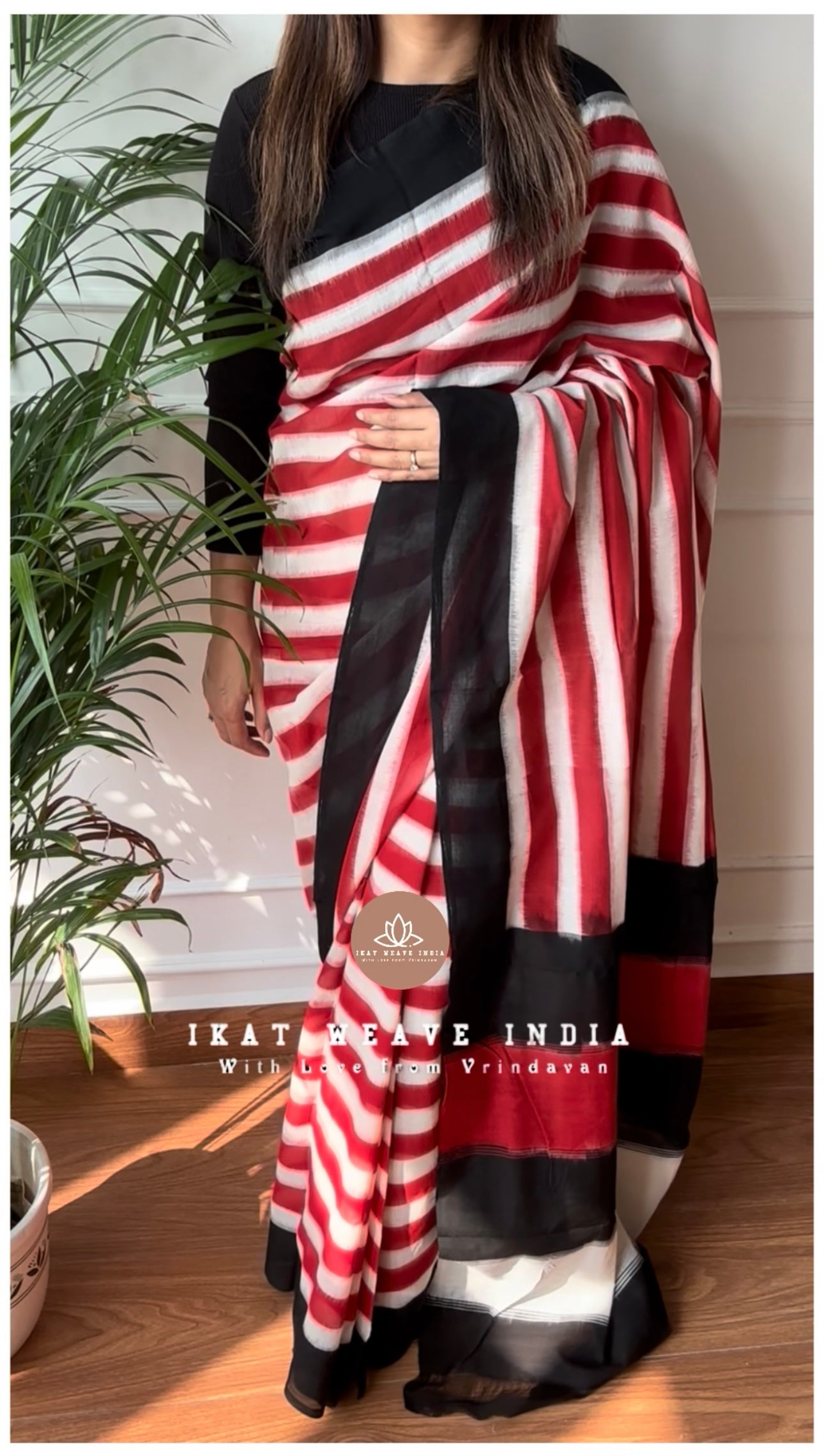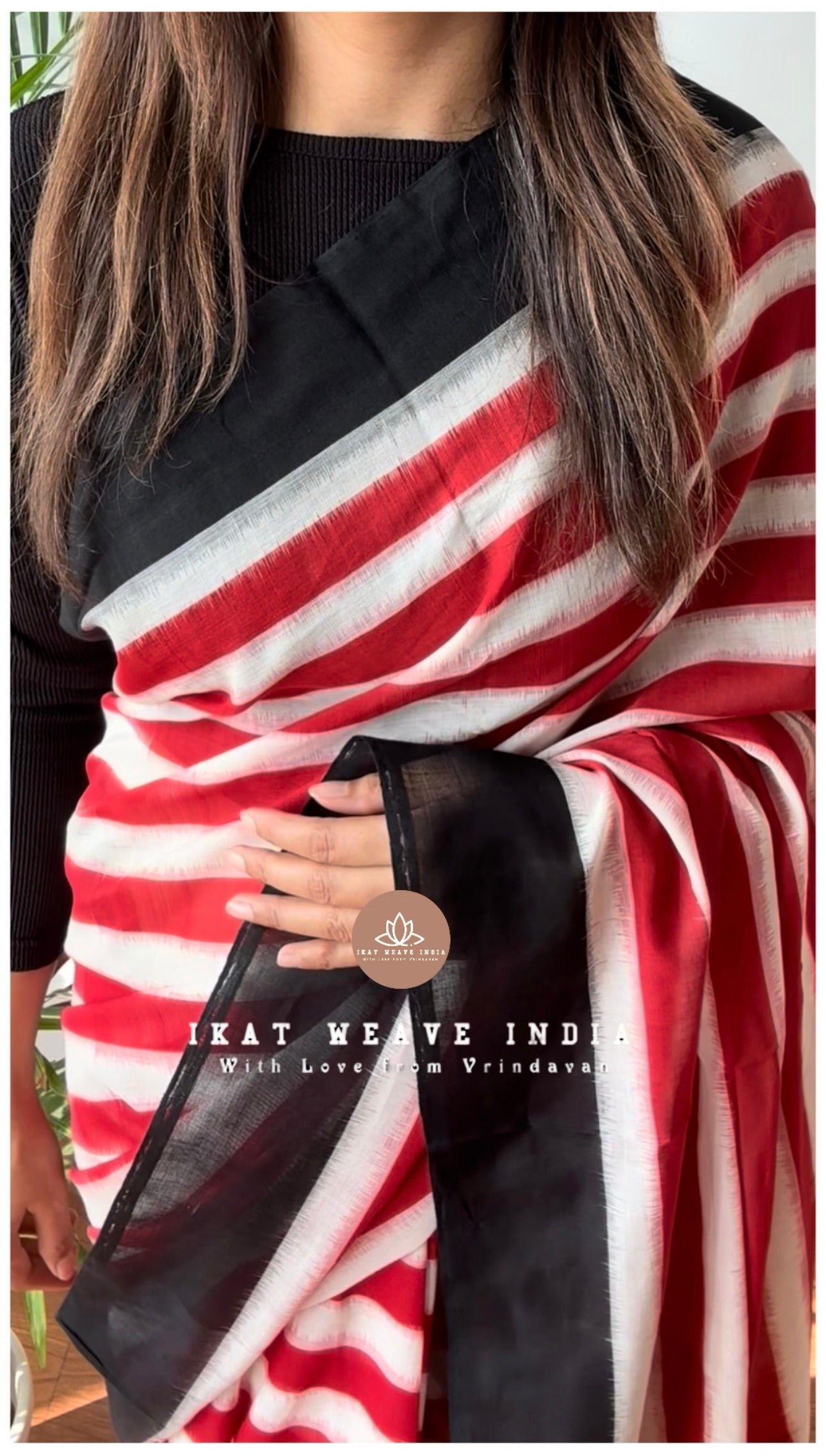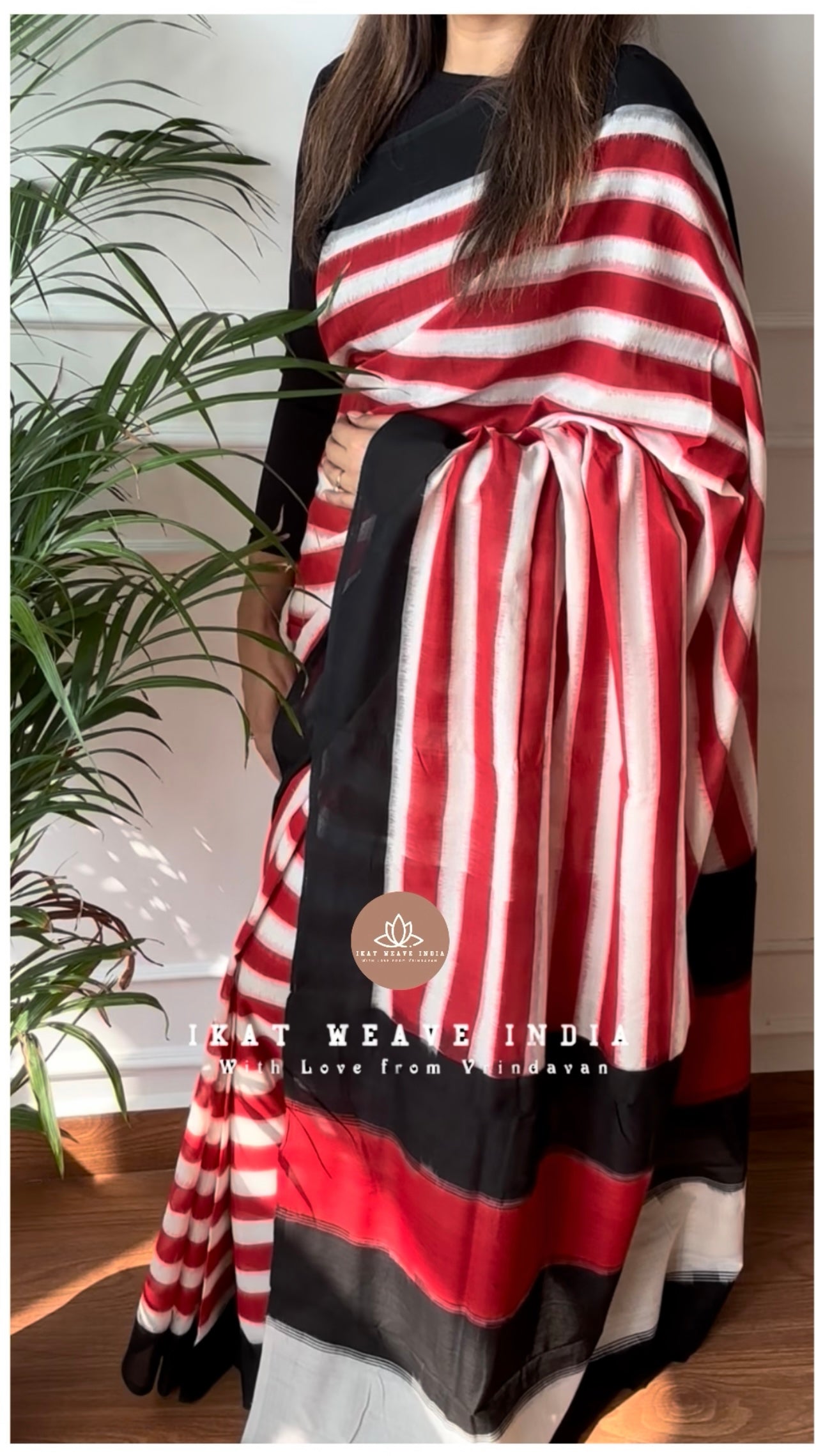 Exquisite handwoven double ikat pure cotton saree, contemporary strips design all over body & beautiful color combination making the saree absolutely stunning. Saree comes with a running blouse piece.