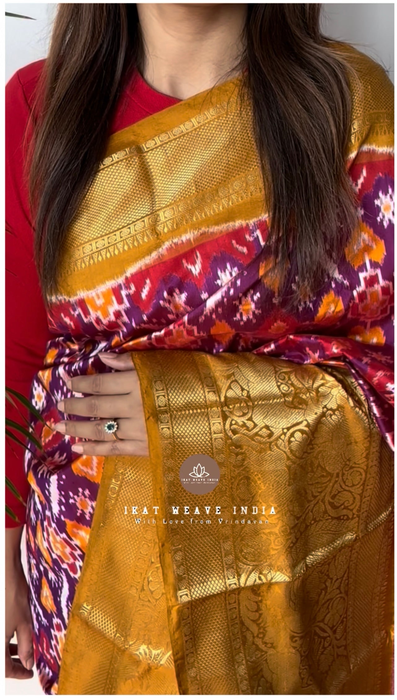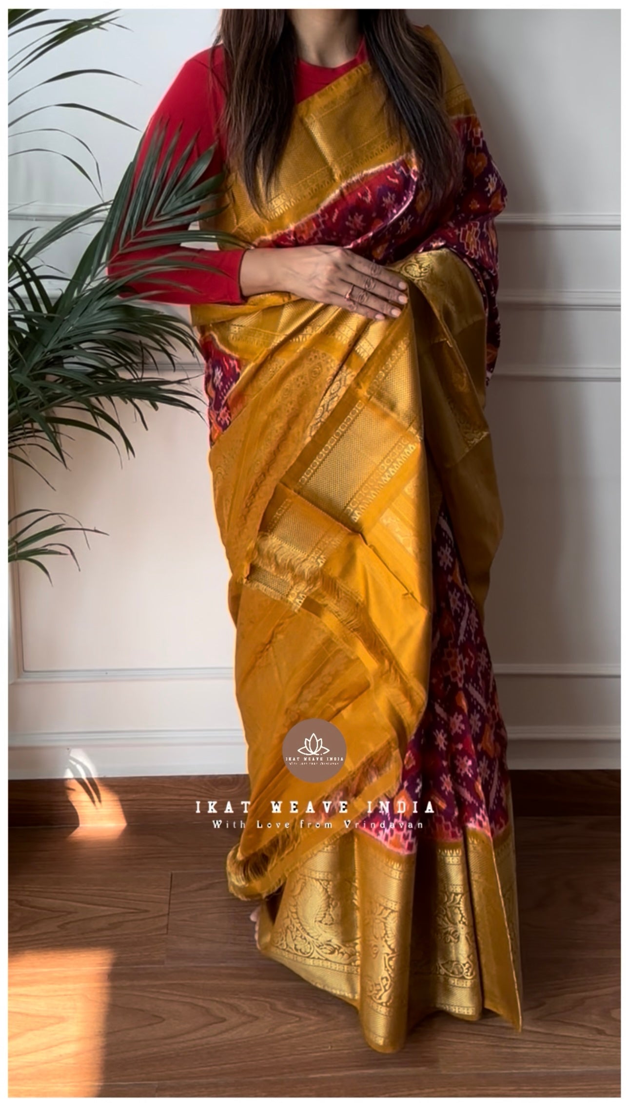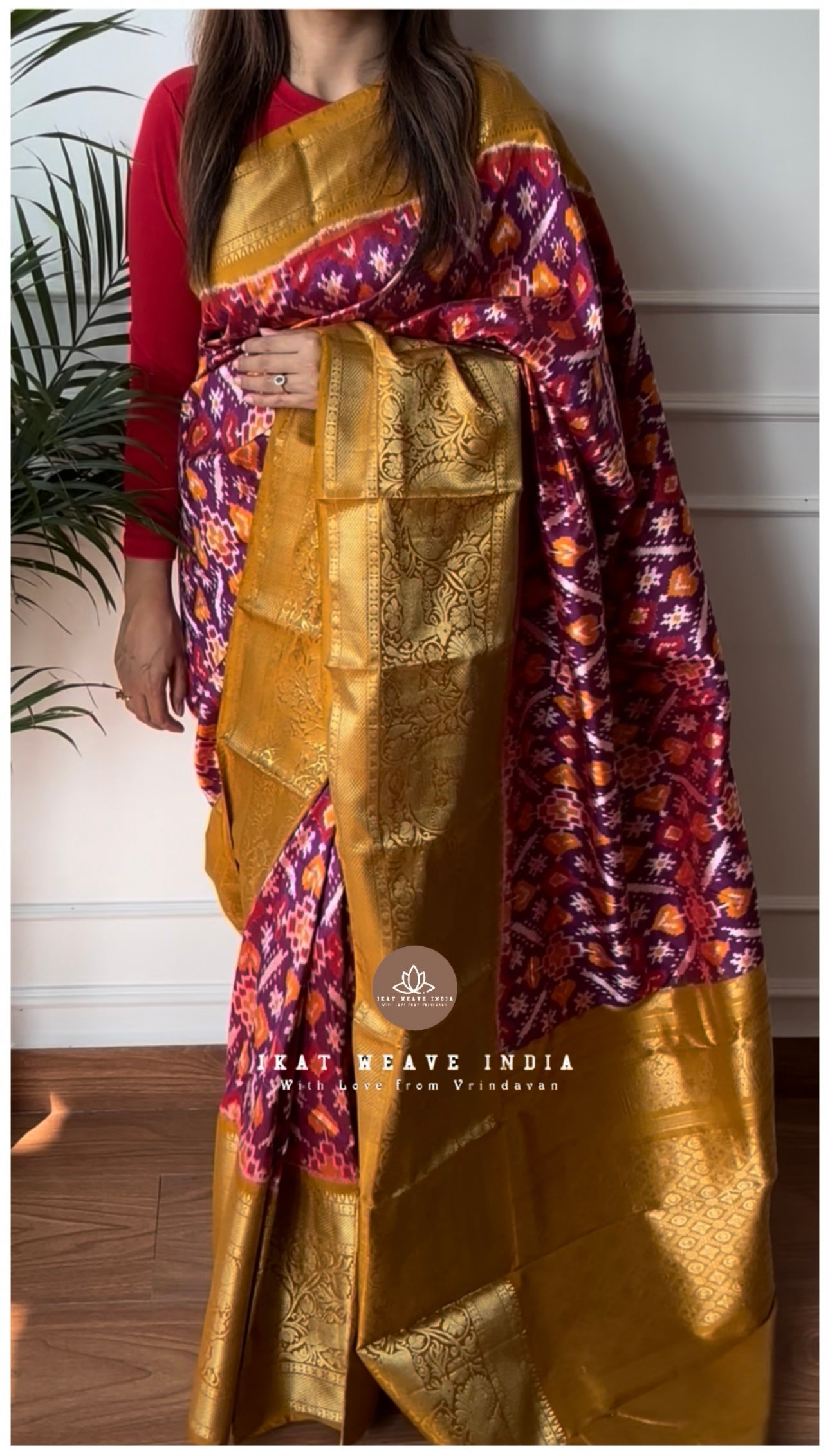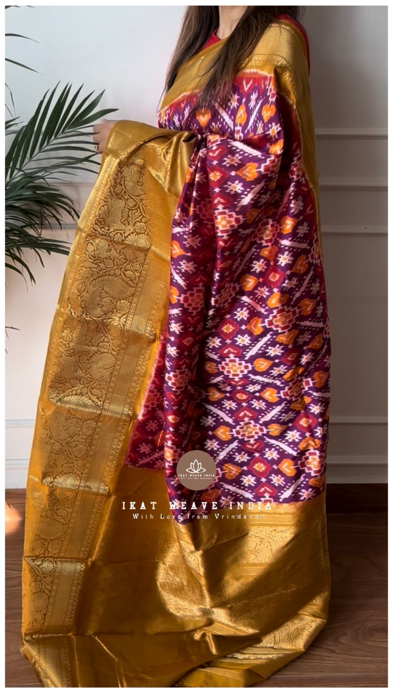 Premium, exclusive & Gorgeous handwoven pure silk Ikat saree with Kanchi Zari Border from Pochampally.A symbol of grace,Luxury and tradition.Saree comes with a running blouse piece.