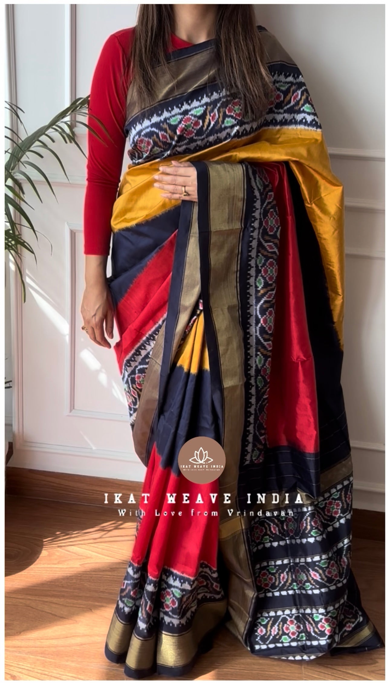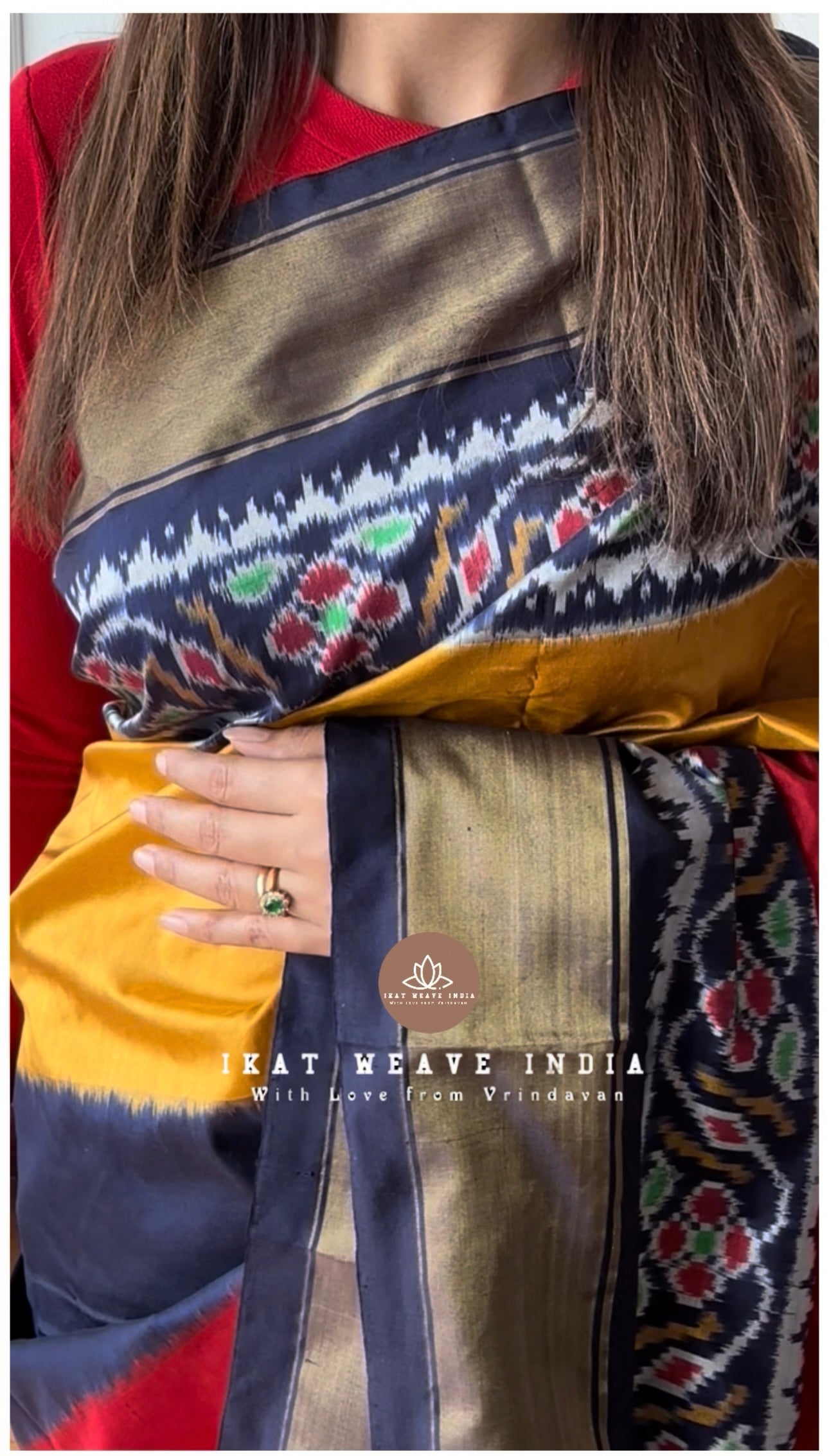 Exquisite double Ikat handwoven pure silk saree, contemporary idesign intricate border and pallu making the saree absolutely stunning. Saree comes with a running blouse piece.