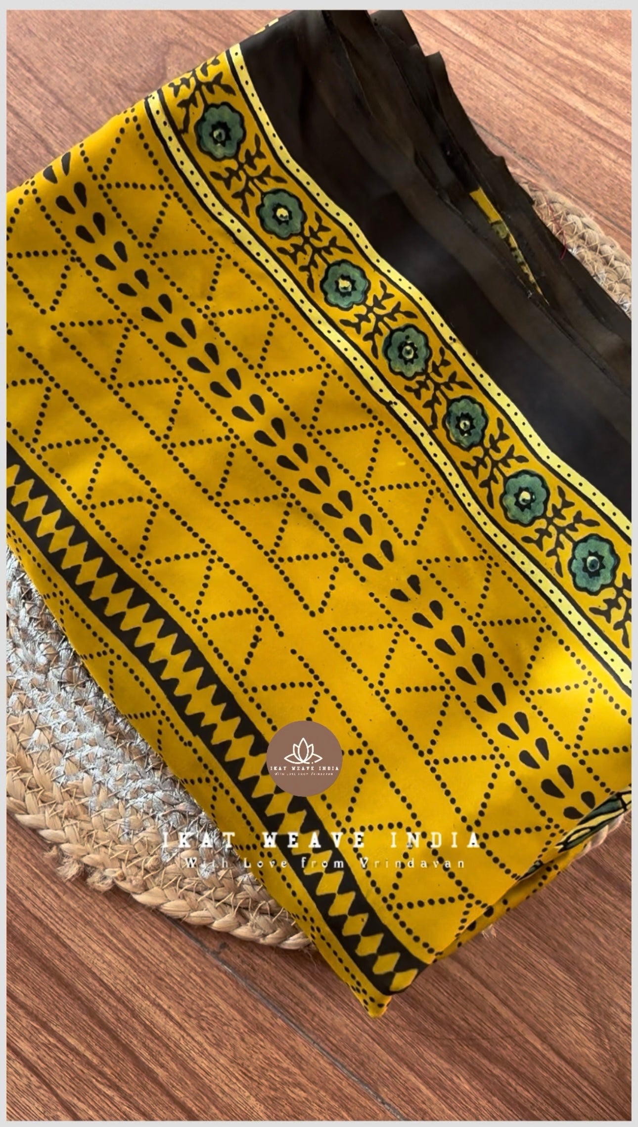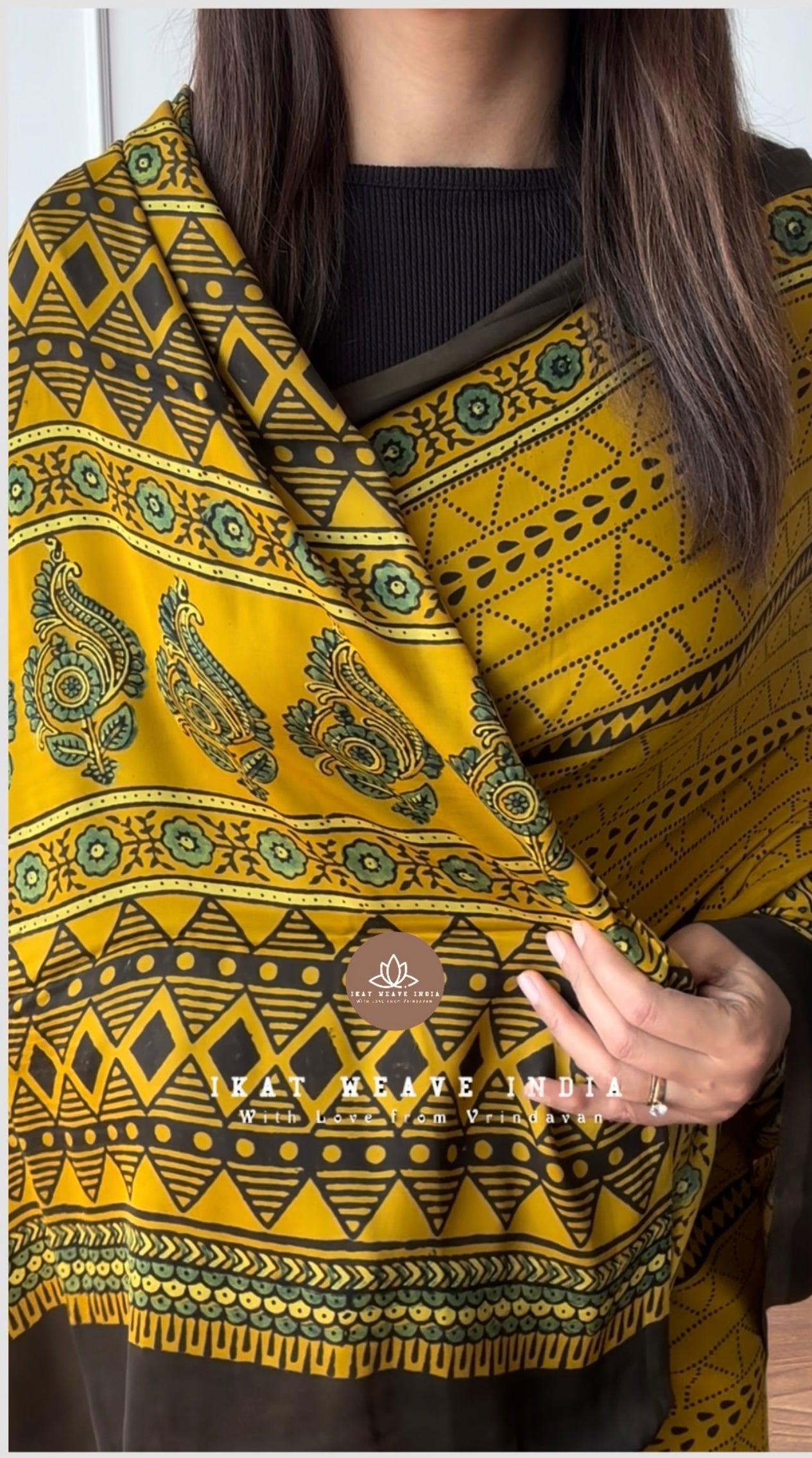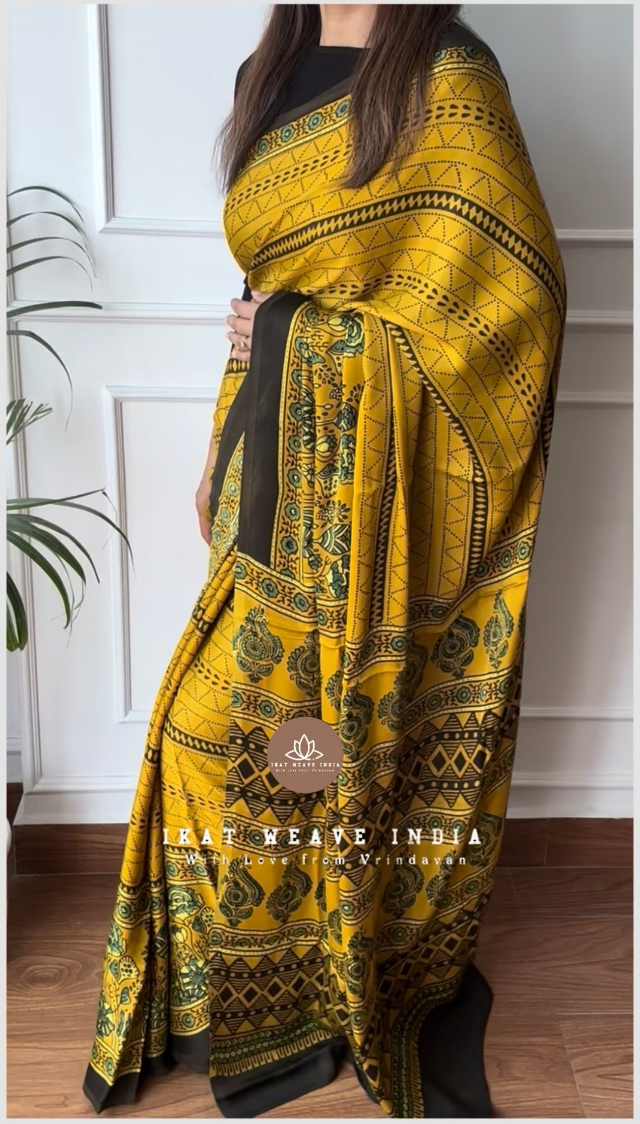 Natural dyed Ajrakh modal silk sarees Lustrous and exceptional craftsmanship. Handmade and handcrafted with traditional designs which reflect the rich cultural identity and skilful artistry that flourished in Gujarat over the time.